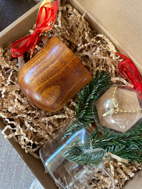 Inside, you’ll find a timeless wooden mug for everyday use, metal spoon for brewing and stirring, and a glass measuring cup designed to bring intention and accuracy to each cup. A minimalist coffee necklace adds a subtle, wearable nod to the daily ritual, while a 3oz sample bag of our seasonal Christmas Blend invites you to savor the experience from the very first brew.